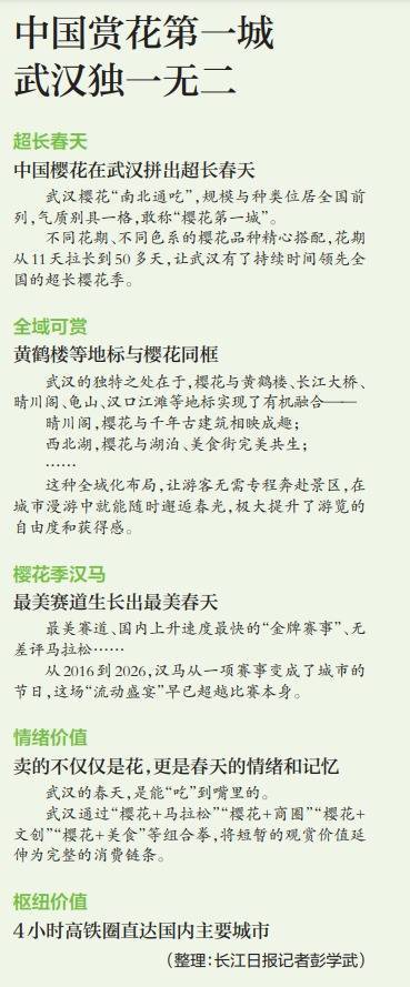 武汉赏花经济独有性在哪儿?4月10日,长江日报记者探访文旅内行、旅游博主、旅行社崇拜东说念主及各地旅客后发现,从“相约春天赏樱花”到东说念主们心中“春天最好的神气”,武汉的握续走红,是一座城市对“春光经济”的深入贯穿与告捷践诺——最好的春天,就在满城花开、勃勃渴望的城市生涯里。
