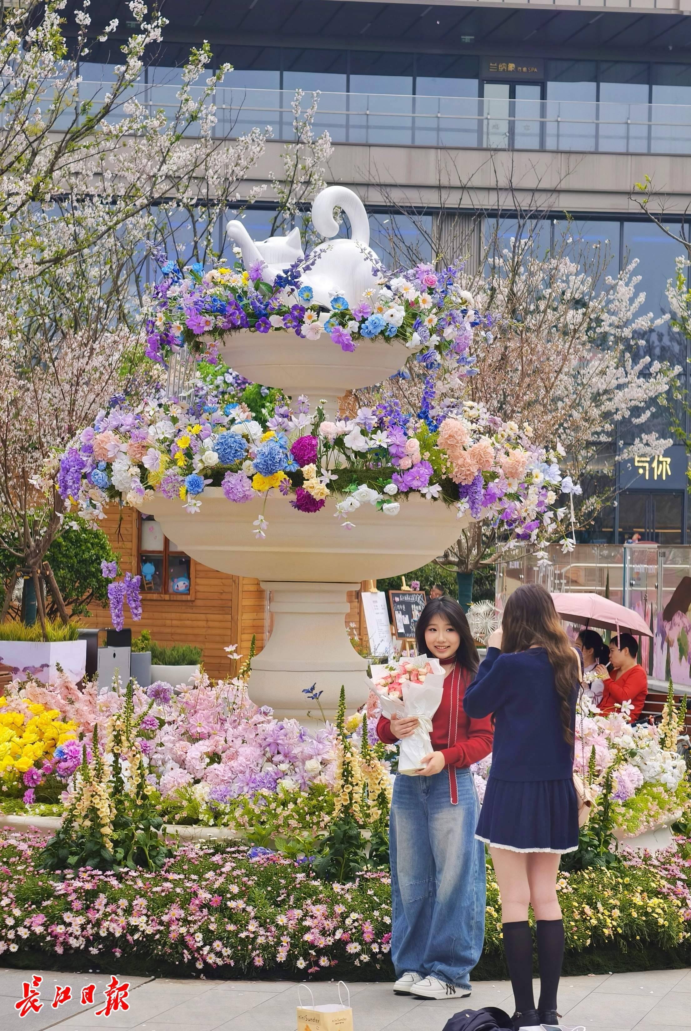 武昌滨江天街将油画中的花圃搬进城市商圈,市民在莫奈花圃风喷泉间逛街赏游,春日温情扑面而来。 记者苗剑摄