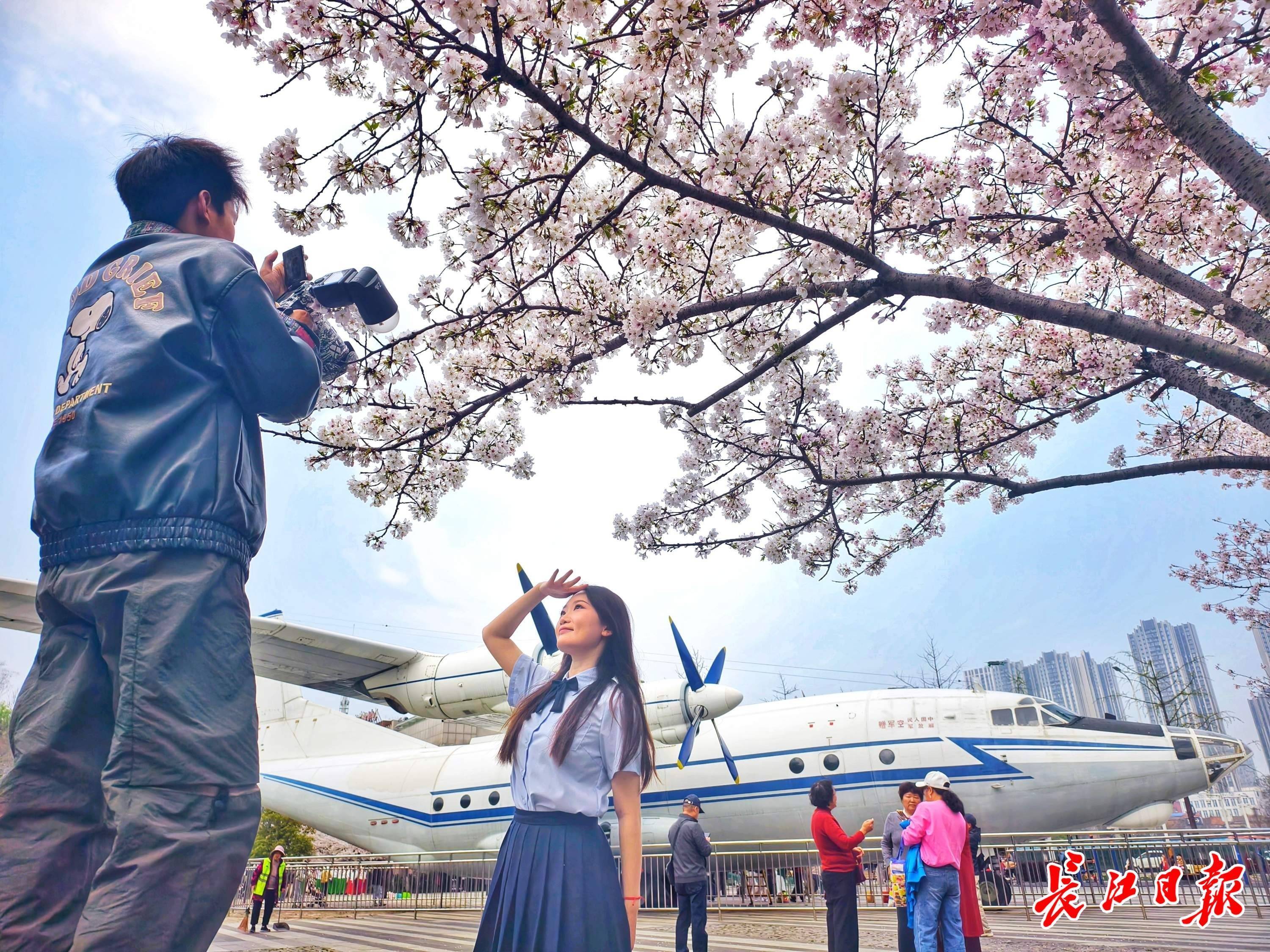 汉口王家墩公园,市民旅客在樱花掩映的飞机前拍照。记者苗剑摄