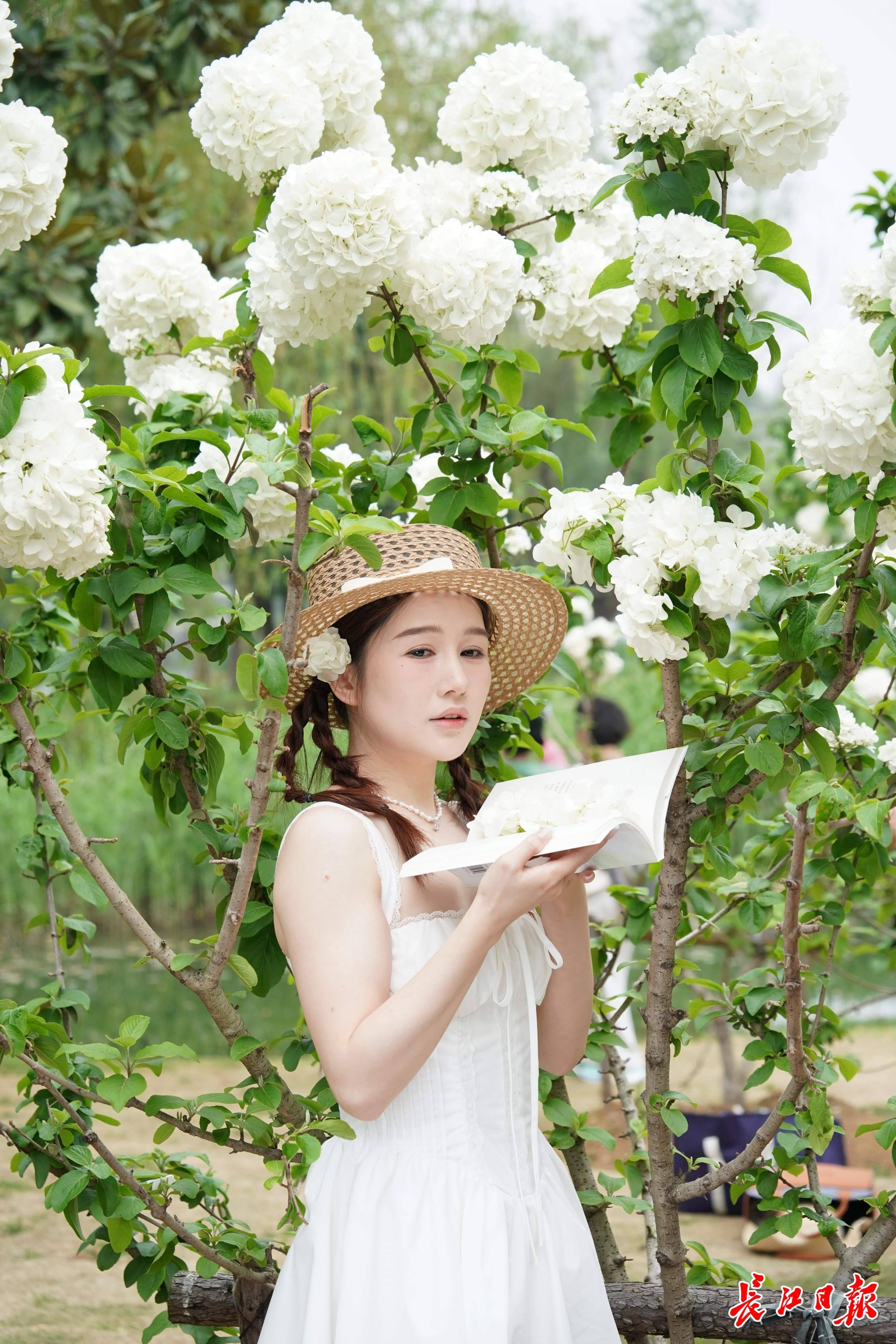 沙湖公园木绣球迎来盛花期,旅客踱步花间,感受春日好意思好。 记者詹松摄