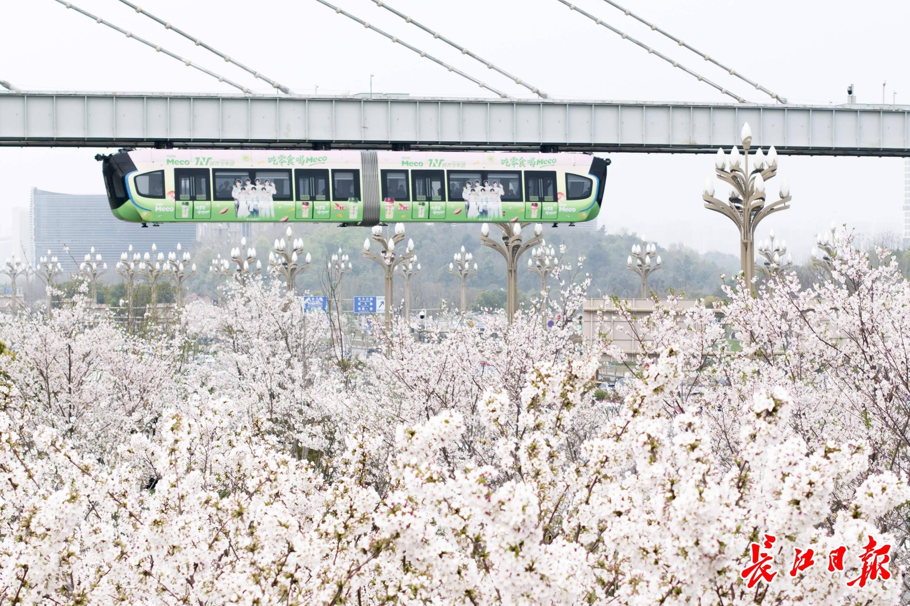光谷空轨再见盛放樱花,赛博赏樱成春日顶流。 记者胡冬冬摄