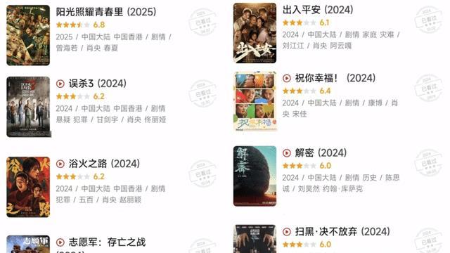 《阳光照射芳华里》6.8,《误杀3》6.2,《浴火之路》6.2,《收支吉祥》6.1,《祝你幸福》6.4,《扫黑·毫不毁掉》6.0。