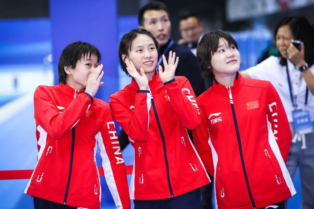 2023年多哈世锦赛上的「三小只」,全红婵(左)、陈芋汐(中)和张家王人(右)